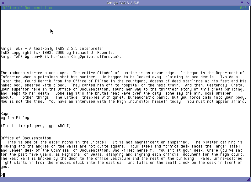 Amiga TADS, running Ian Finley's Kaged,