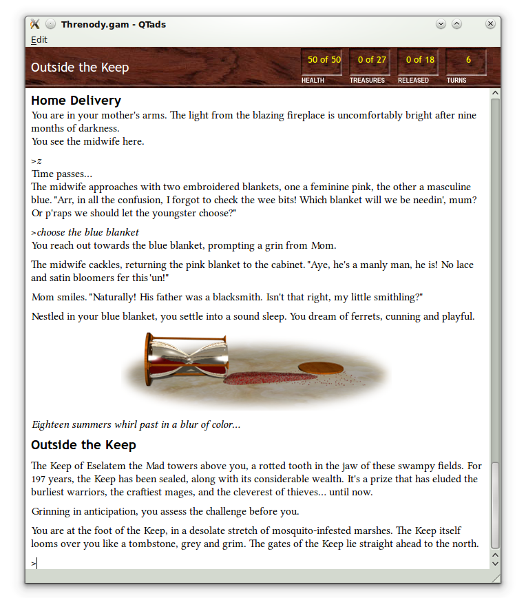 TADS for Linux (in a Linux console window), running