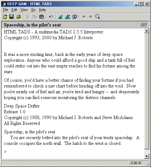 HTML TADS for Windows, running Deep Space Drifter.