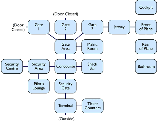As an example, well implement a game that takes place in a small airport. Our airport will have a terminal area, a concourse, and a gate area. Well also have a plane parked at one of the gates. The terminal area will have a ticket counter, and a metal detector leading into the concourse. In the concourse, there will be a snack bar, and a locked door leading off into a security area. The gate area will have a couple of gates, plus a locked maintenance room. Heres the basic map well be implementing.