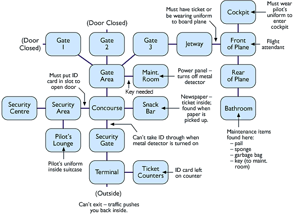 This map conveniently has a couple of locked areas, which we can use for puzzles. In addition, we can probably find some use for the metal detector, since it will prevent the player from carrying any objects through it. The plane can also be a puzzle, since youd normally need a ticket to board a plane. Plus, the cockpit should be restricted to airline personnel.